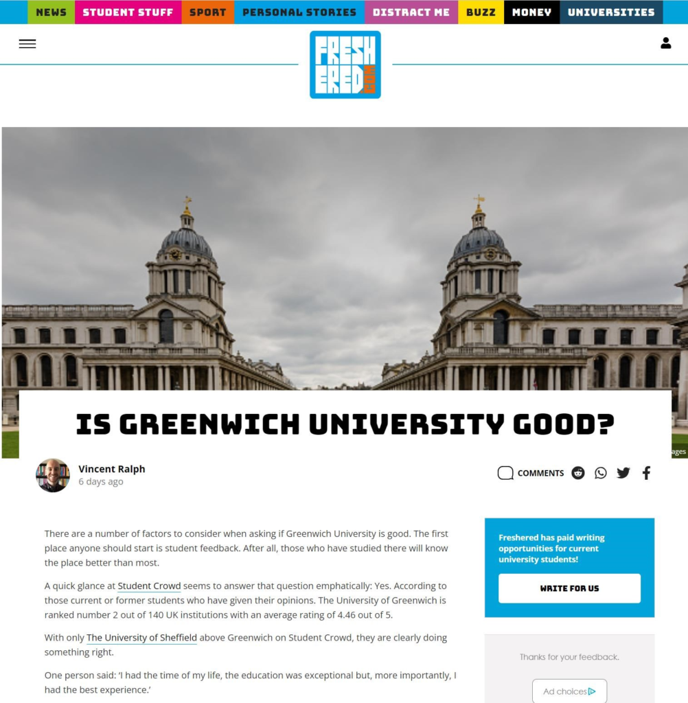 Tên bài viết trên website Freshered về các trường đại học Anh là “Đánh giá chất lượng Đại học Greenwich”. Vincent Ralph, tác giả của bài viết, đã đưa ra những đánh giá đa chiều về trường Đại học Greenwich.