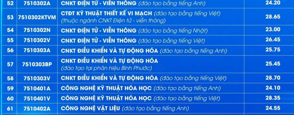 Ngành Công nghệ kỹ thuật điều khiển tự động hoá (đào tạo bằng tiếng Việt) tại Trường Đại học Sư phạm Kỹ thuật TP.HCM là ngành tạo nên mức chênh lệch kỷ lục trong kỳ tuyển sinh năm nay. Với điểm sàn chỉ 15, nhưng điểm chuẩn của ngành này lên tới 28,7 – chênh lệch đến 13,7 điểm. Đây là khoảng cách lớn nhất giữa điểm chuẩn và điểm sàn được ghi nhận trong năm.