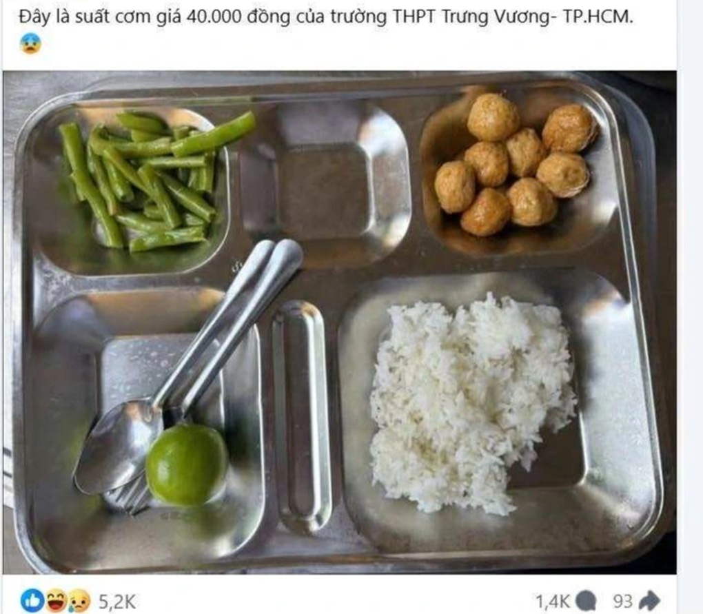 Bữa ăn bán trú trong trường học luôn là mối quan tâm hàng đầu của phụ huynh và học sinh. Mới đây, mạng xã hội lan truyền hình ảnh suất ăn trưa bị cho là “quá ít đồ ăn mặn” tại Trường THPT Trưng Vương (quận 1, TP.HCM), thu hút nhiều lượt chia sẻ và bình luận trái chiều. Câu hỏi đặt ra: với mức giá gần 40.000 đồng, chất lượng bữa ăn thế nào?